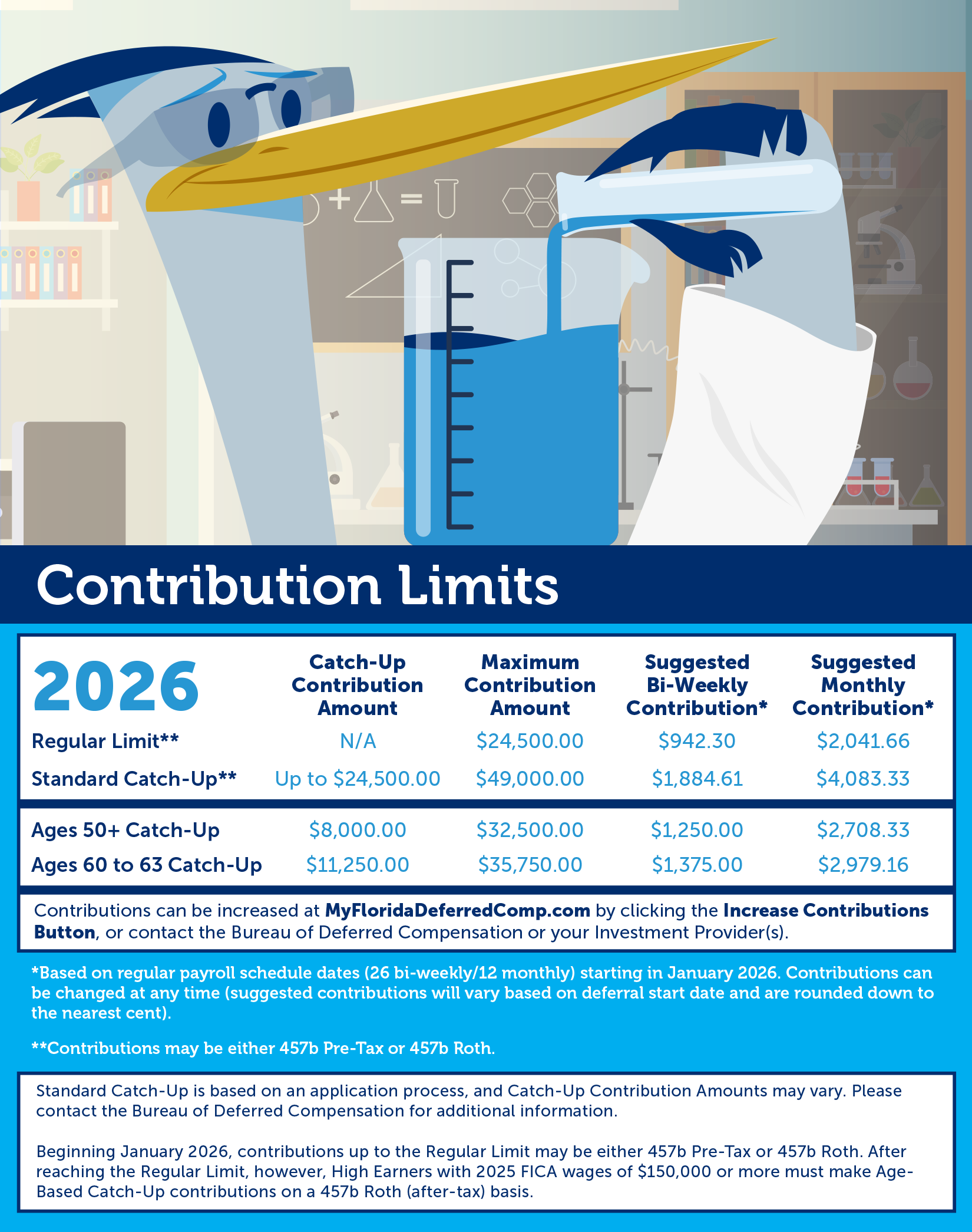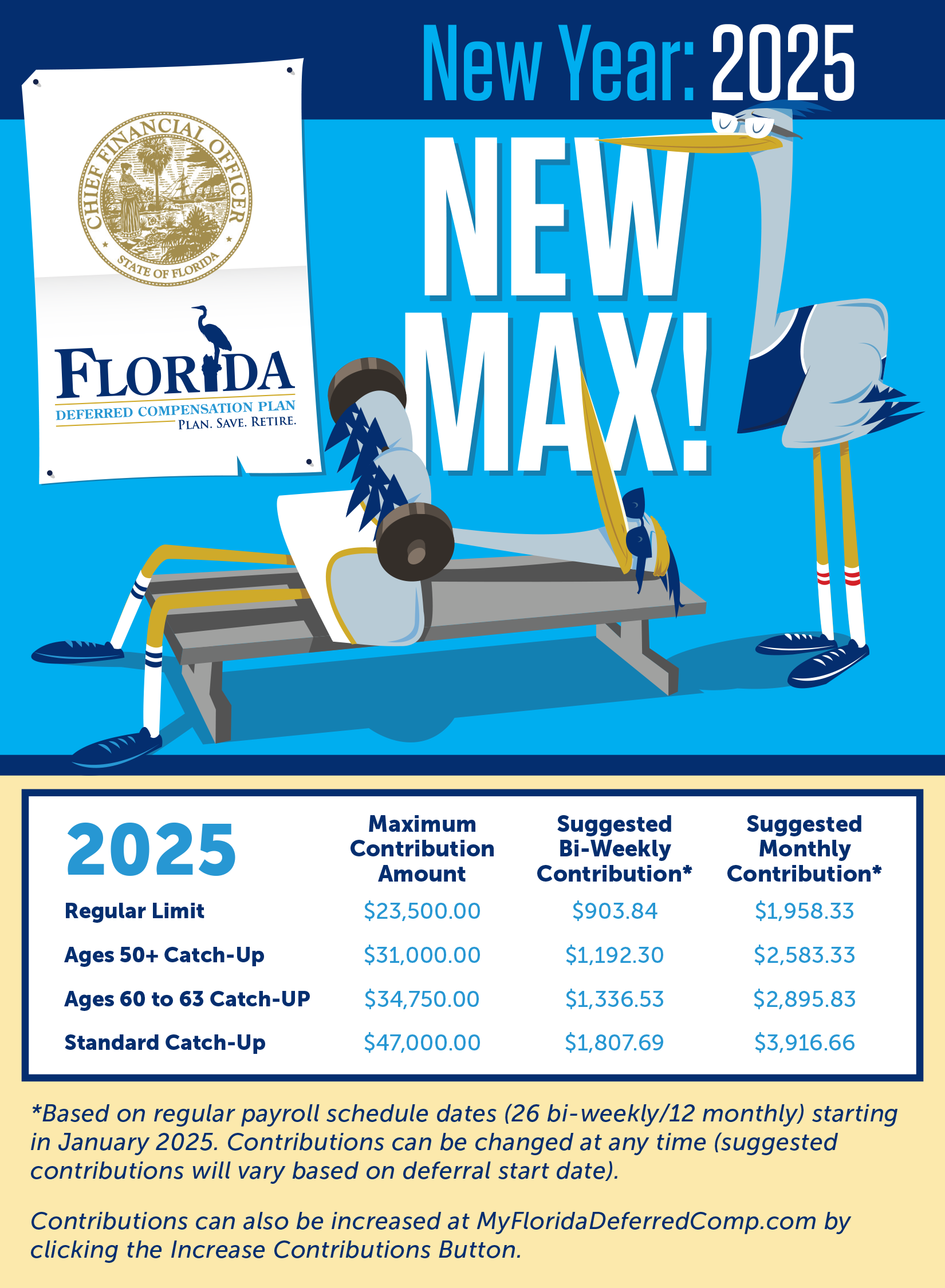 Minimum contributions, per pay period, for the Florida Deferred Compensation Plan are $10 (bi-weekly) or $20 (monthly). Consider maximizing contributions to the Plan, and Increase Contributions, today.