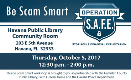 TALLAHASSEE, Fla. – Chief Financial Officer Jimmy Patronis today announced that the Department of Financial Services, in partnership with local officials, is hosting a free financial safety workshop for seniors, their families and caregivers this week in Havana, Florida. This ‘Be Scam Smart’ workshop will teach attendees about how to spot a scam, how scams work and steps they can take to protect themselves.